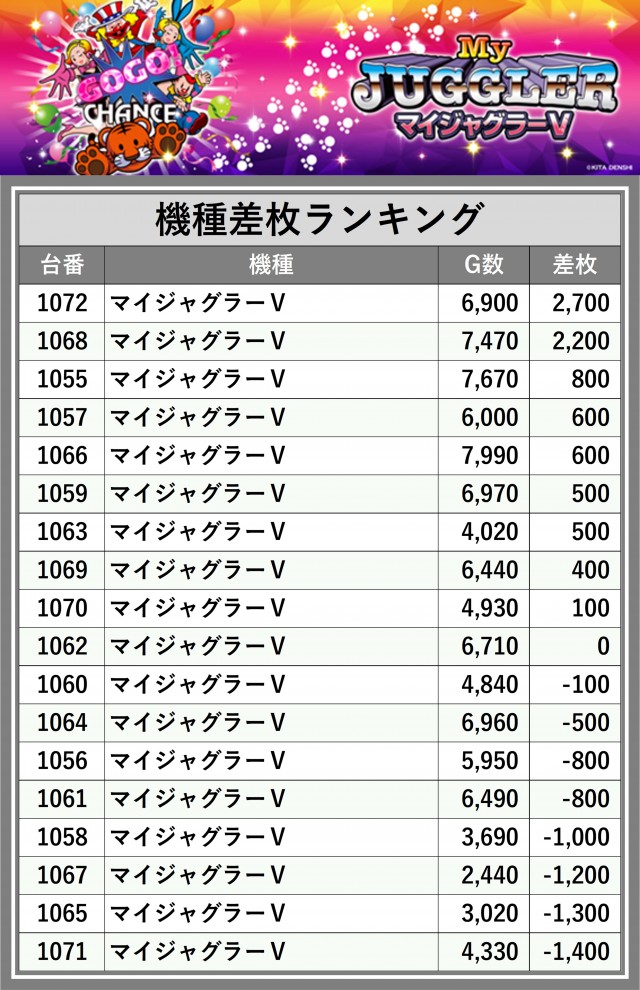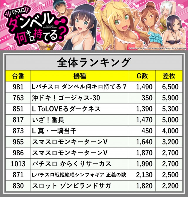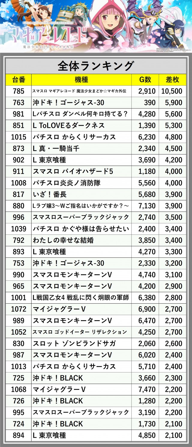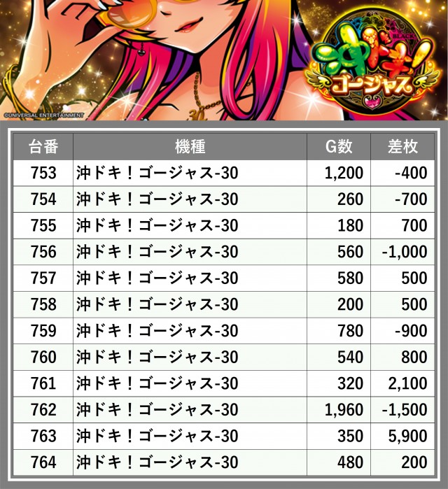 厳選された取材対象機種をはじめ、その他スロット全体から好記録が飛び出した!プレイヤーが楽しんだ1日を下記データにて振り返ってみて欲しい。
