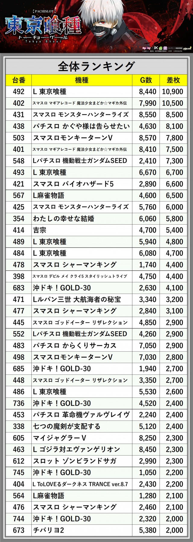 厳選された取材対象機種をはじめ、その他スロット全体から好記録が飛び出した!プレイヤーが楽しんだ1日を下記データにて振り返ってみて欲しい。