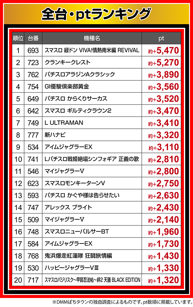 ほかにも、『スマスロ ギルティクラウン2』の642番台や『新ハナビ』の777番台など、多くの台が約+3,000ptオーバー。