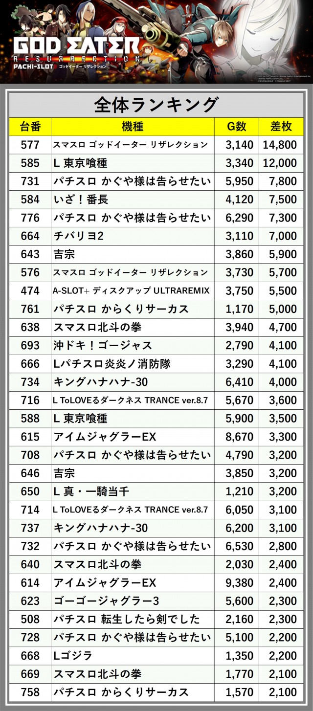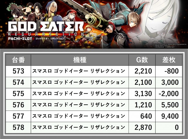 厳選された取材対象機種をはじめ、その他スロット全体から好記録が飛び出した!プレイヤーが楽しんだ1日を下記データにて振り返ってみて欲しい。