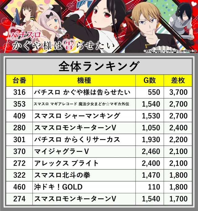 ※差枚数順に掲載しています
