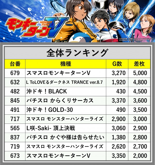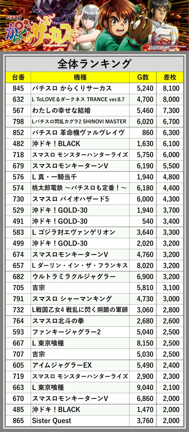 厳選された取材対象機種をはじめ、その他スロット全体から好記録が飛び出した!プレイヤーが楽しんだ1日を下記データにて振り返ってみて欲しい。