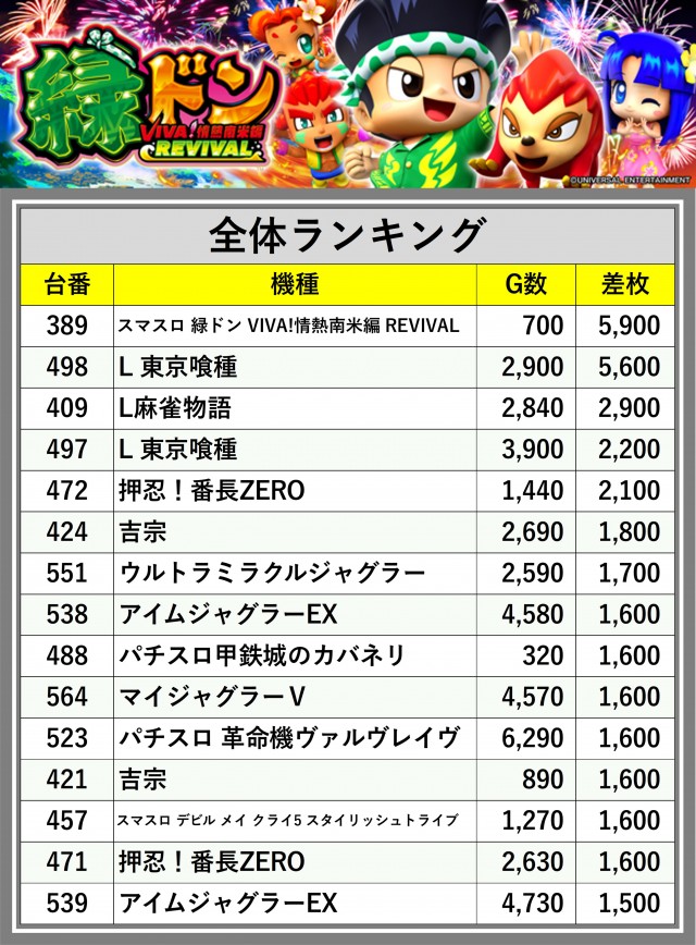 厳選された取材対象機種をはじめ、その他スロット全体から好記録が飛び出した!プレイヤーが楽しんだ1日を下記データにて振り返ってみて欲しい。