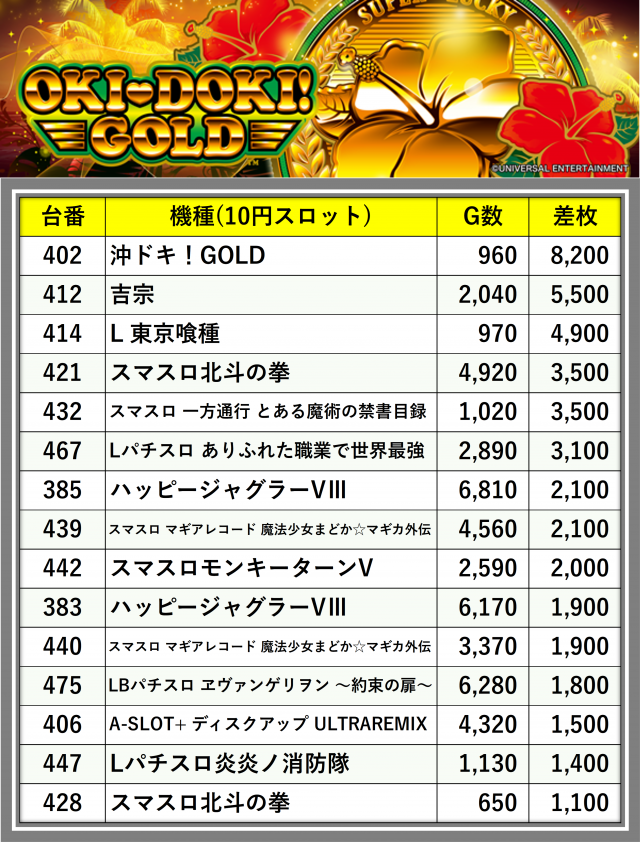 厳選された取材対象機種をはじめ、その他スロット全体から好記録が飛び出した!プレイヤーが楽しんだ1日を下記データにて振り返ってみて欲しい。