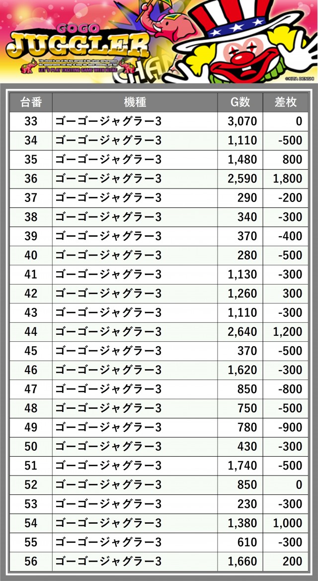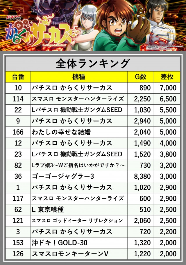 厳選された取材対象機種をはじめ、その他スロット全体から好記録が飛び出した!プレイヤーが楽しんだ1日を下記データにて振り返ってみて欲しい。