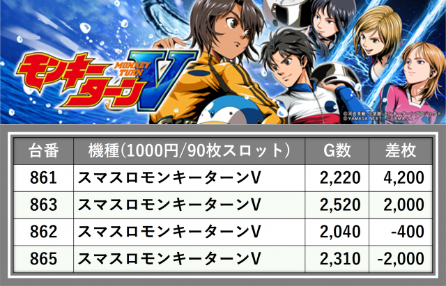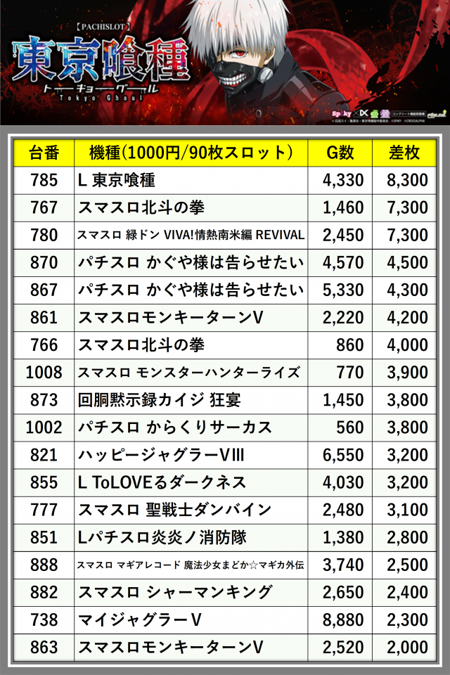厳選された取材対象機種をはじめ、その他スロット全体から好記録が飛び出した!プレイヤーが楽しんだ1日を下記データにて振り返ってみて欲しい。