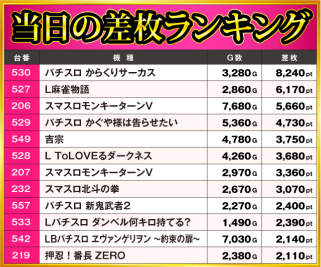 この日、最もプレイヤーの注目を集めたのが『パチスロ からくりサーカス』で、530番台が+8,240ptを記録しランキングトップに。次いで『L麻雀物語』から+6,170pt、『スマスロモンキーターンV』から+5,660ptが飛び出すなど、人気のスマスロを中心に好成績が続出し店内を盛り上げていた。