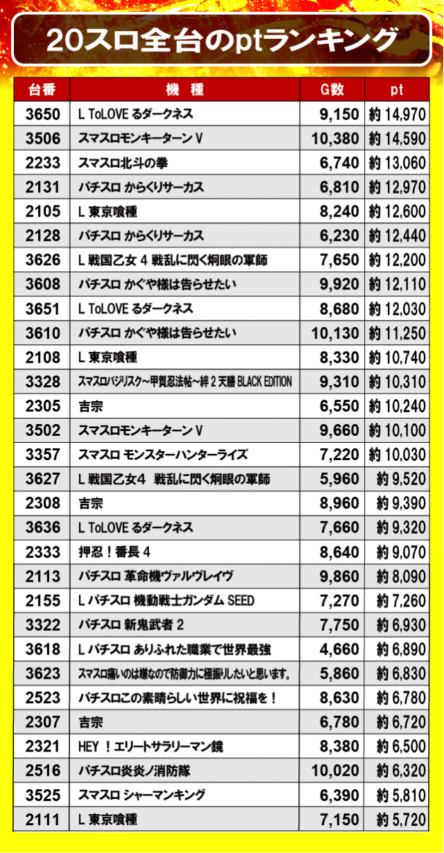 ①20スロ全台のptランキング
