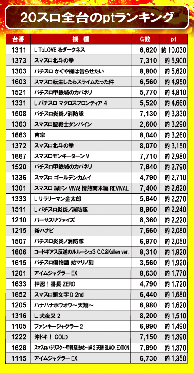 ①20スロ全台のptランキング