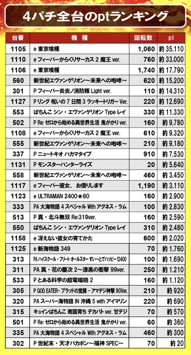 TOPは現在最も人気と言っても過言ではないほど高稼働となっている『e 東京喰種』から約35,110pt!そして、TOP2が『eフィーバーからくりサーカス2 魔王ver.』から約33,000pt!この2台がリードする形で店内を熱く盛り上げた。