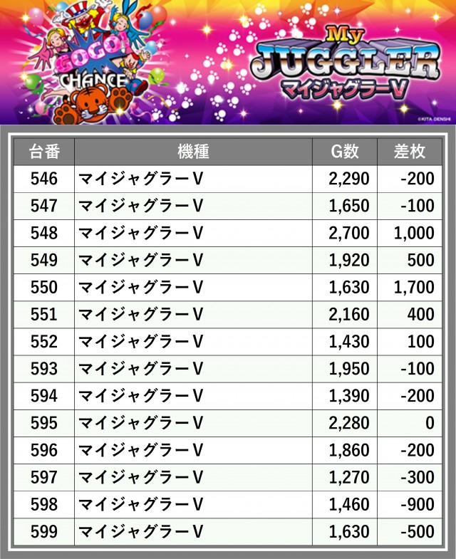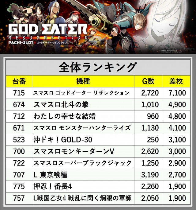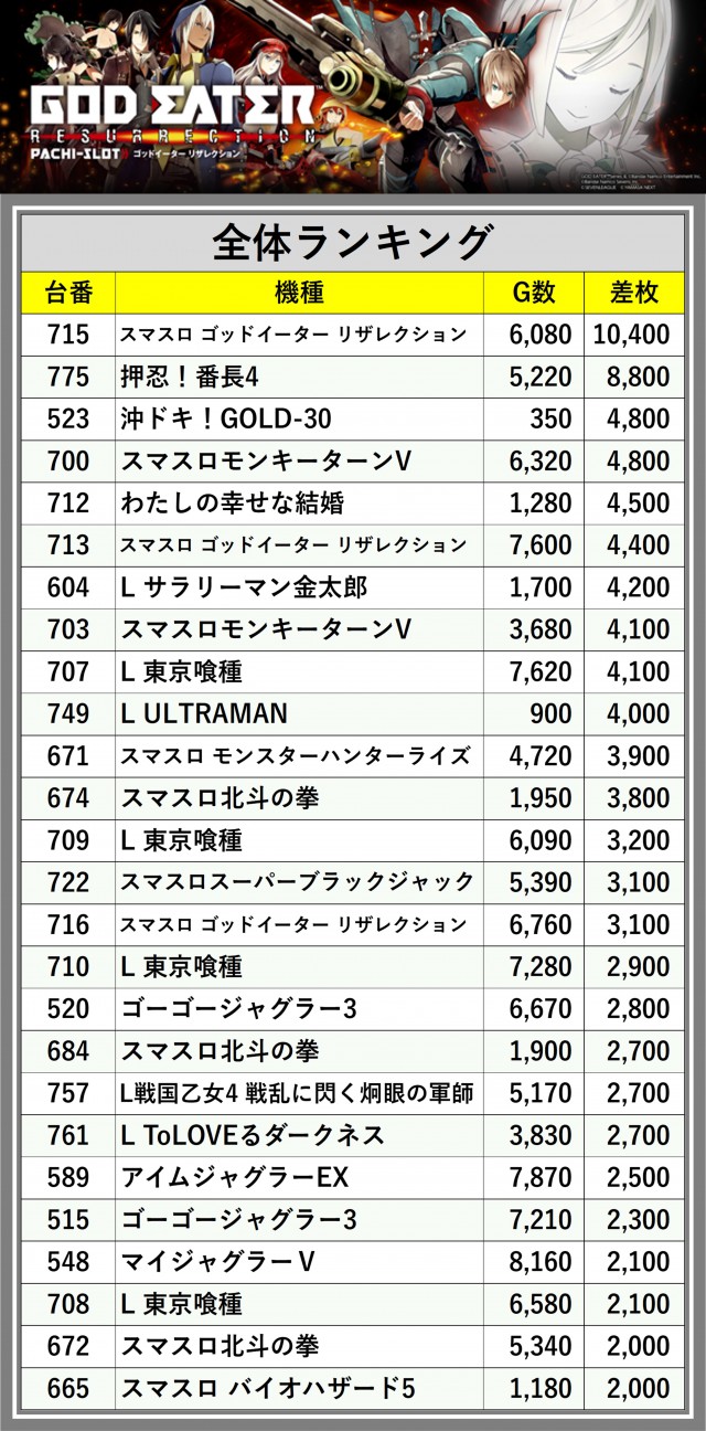 厳選された取材対象機種をはじめ、その他スロット全体から好記録が飛び出した!プレイヤーが楽しんだ1日を下記データにて振り返ってみて欲しい。