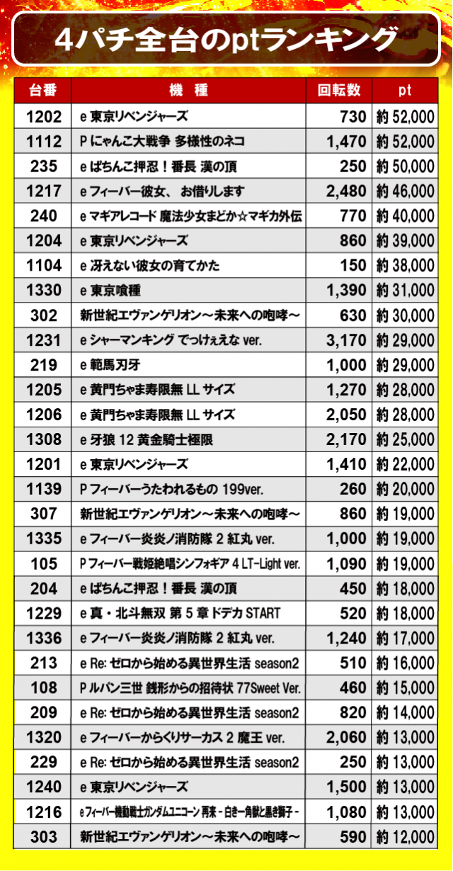 『e東京リベンジャーズ』『P にゃんこ大戦争 多様性のネコ』『eぱちんこ押忍!番長 漢の頂』から約50,000ptOVERをマークし、大きな熱気を生み出していた。またTOP30は、新台から人気機種と様々な機種がズラリと並び、至る所でチャンスが隠されていたようだ!
