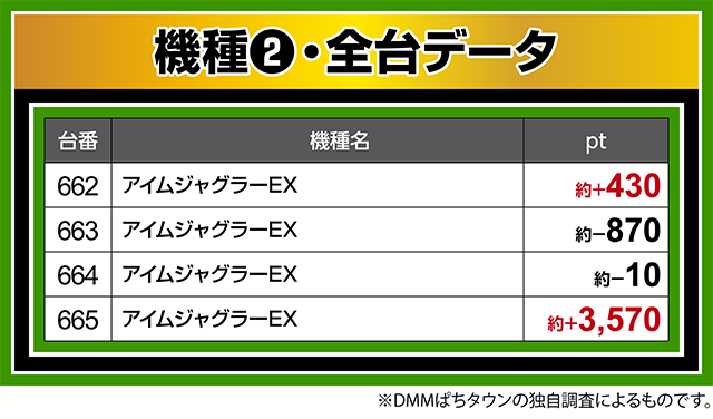 『アイムジャグラーEX』も2台がプラスとなり、665番台は約+3,500ptオーバー。