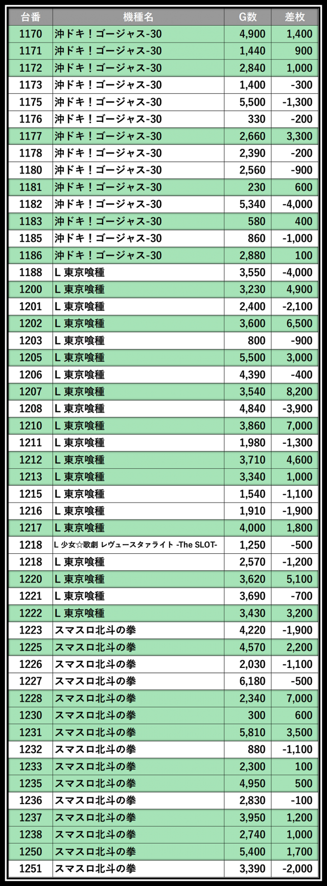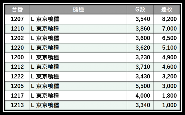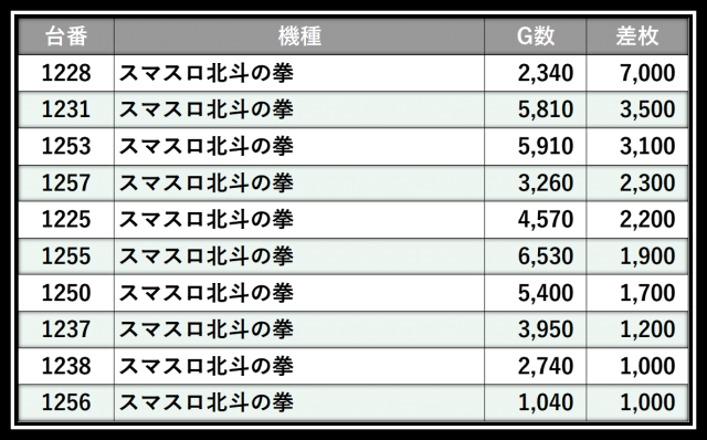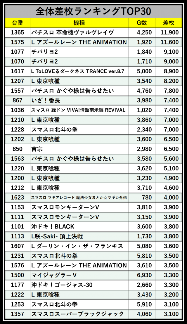 ※差枚数順に掲載しています