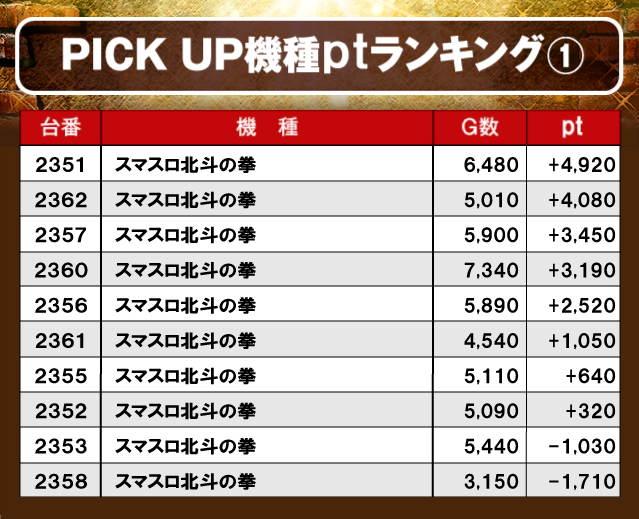 まとまったptを獲得し、且つしっかりと打ち込まれている台が複数確認できた『スマスロ北斗の拳』。高い熱量で店内を盛り上げファンを歓喜させた存在だったと言えるだろう!