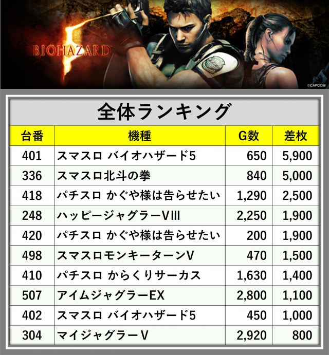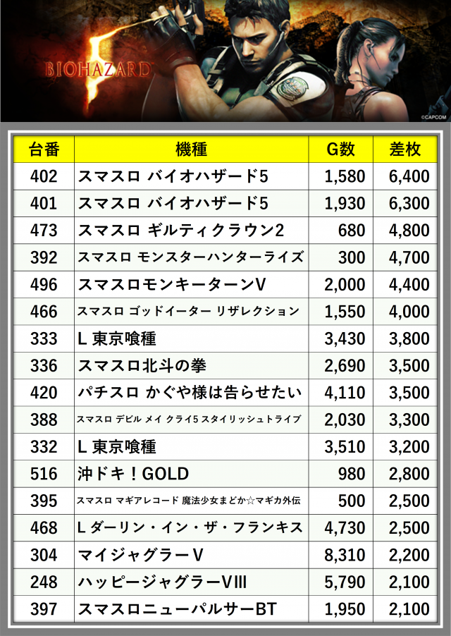 ※差枚数順に掲載しています
