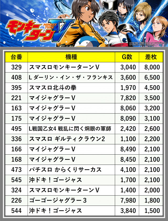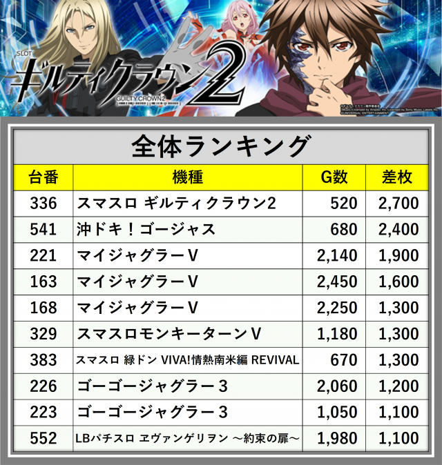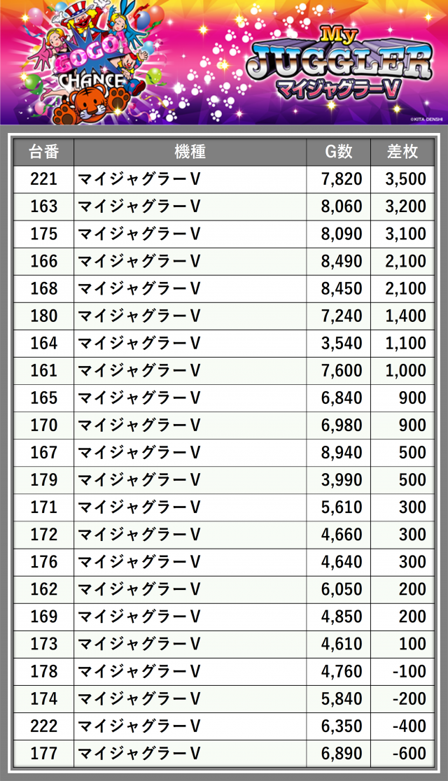 厳選された取材対象機種をはじめ、その他スロット全体から好記録が飛び出した!プレイヤーが楽しんだ1日を下記データにて振り返ってみて欲しい。