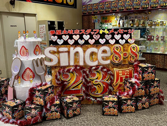 23周年を迎えたホールであり、カウンターの近くには、ケーキの装飾やスタッフからのメッセージなどがあった。