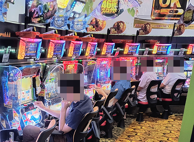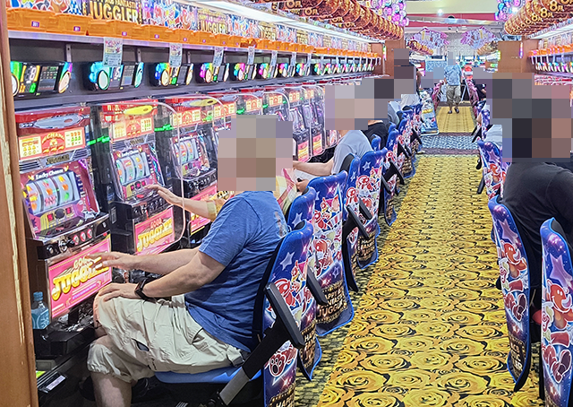 「ゴーゴージャグラー3」や「マイジャグラーⅤ」などでプレイヤーが楽しげに遊技をおこなっており、複数台で華やかなシーンがみられた。