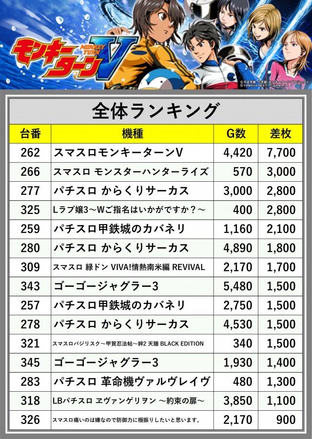 厳選された取材対象機種をはじめ、その他スロット全体から好記録が飛び出した!プレイヤーが楽しんだ1日を下記データにて振り返ってみて欲しい。