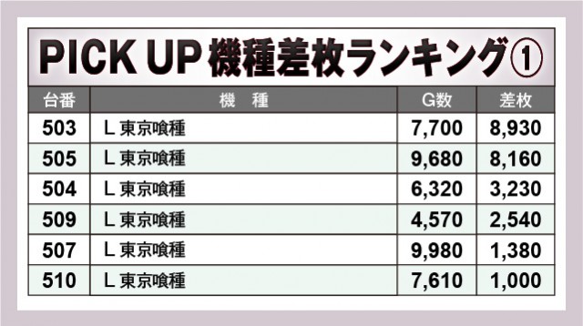 『L 東京喰種』『吉宗』の存在感は大きく、それは前述したように8,000枚台を記録した台が3つあるためだ。同時に見逃せないのが活気の高さで、特に前者は9,000回転台と終日を通して打ち込まれており、明らかな感触を手にしていたのは間違いない。ファンは力強くレバーを叩けたことで、いつもにも増して高い満足感を得られたのではないだろうか。