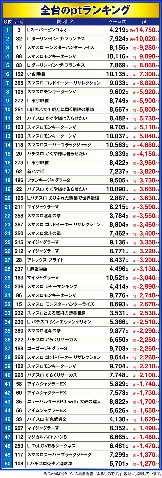 「いざ!番長」の152番台や「スマスロ ゴッドイーター リザレクション」の365番台も約+6,800ptを上回るなど、多くの台に活気があった。