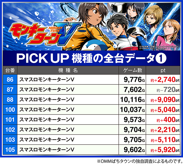 「スマスロモンキーターンV」は8台中7台がプラスとなり、3台が約+5,000pt以上。