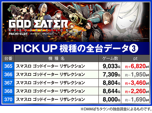 「スマスロ ゴッドイーター リザレクション」も3台が約+2,200ptを上回り、約+7,000ptを目前とした台もあった。