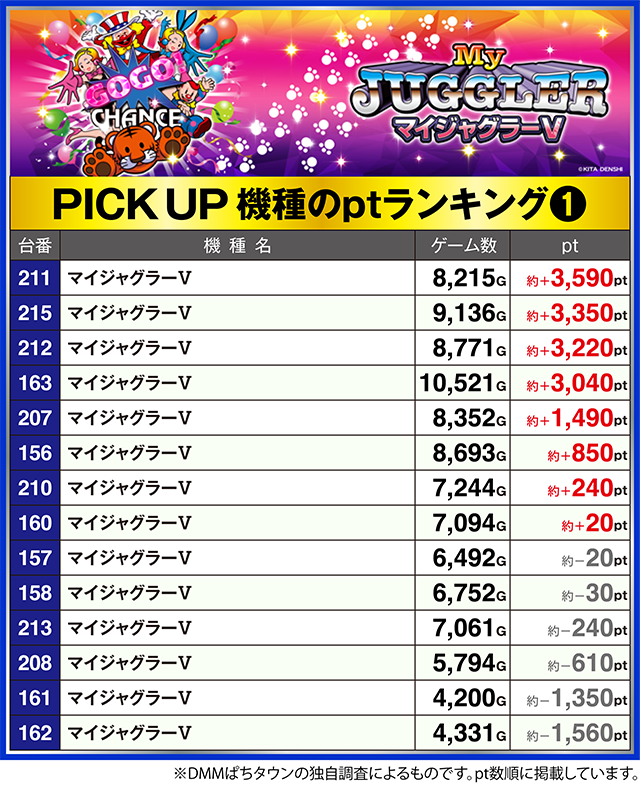 「マイジャグラーⅤ」の4台が約+3,000ptオーバー!!