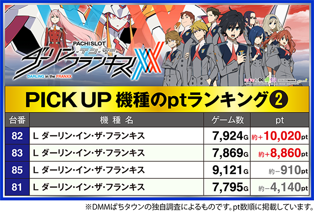 最新機種の「L ダーリン・イン・ザ・フランキス」では、82番台が約+10,000pt以上となった。
