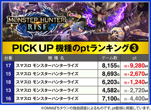 「スマスロ モンスターハンターライズ」の17番台と「スマスロモンキーターンV」の88番台も約+9,000pt超と盛況。
