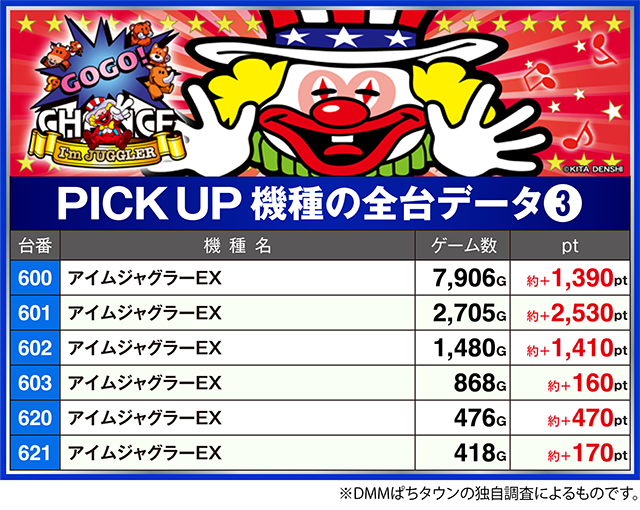 「ハッピージャグラーVⅢ」の607番台や「アイムジャグラーEX」の601番台なども約+2,100pt超。