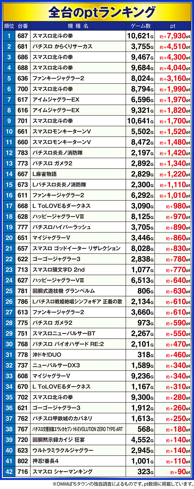 「パチスロ からくりサーカス」の681番台も約+4,500ptを上回った。