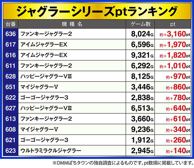 636番台が約+3,100pt以上となったのが、「ファンキージャグラー2」。