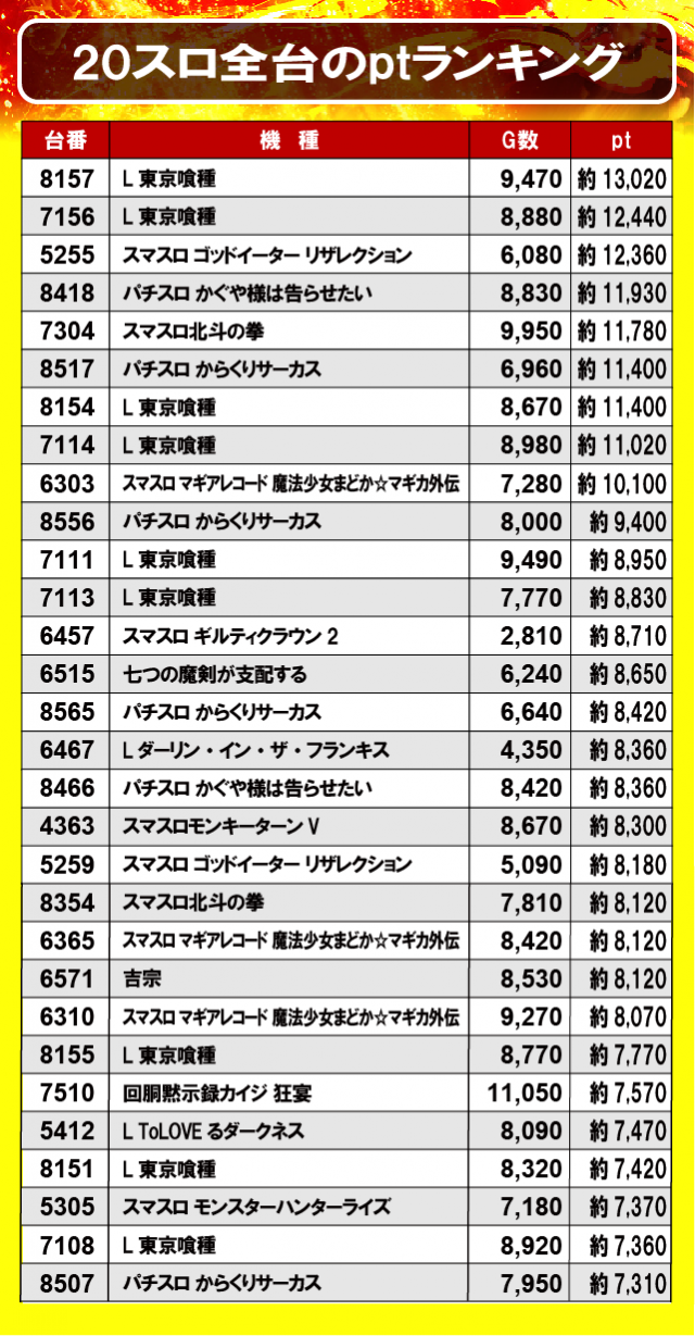 ①20スロ全台のptランキング