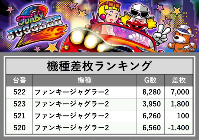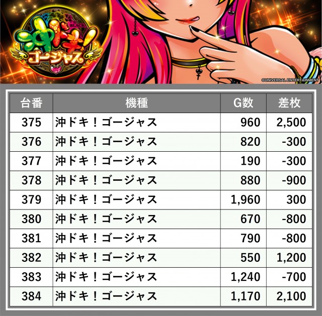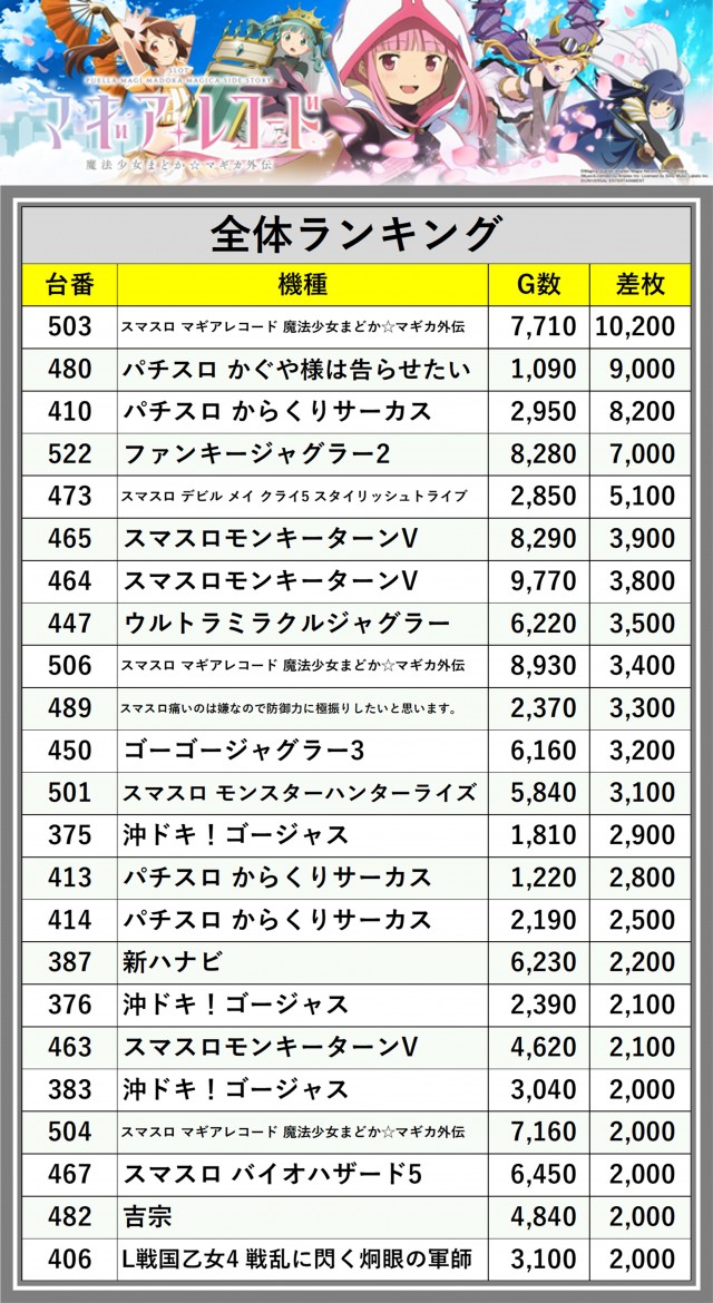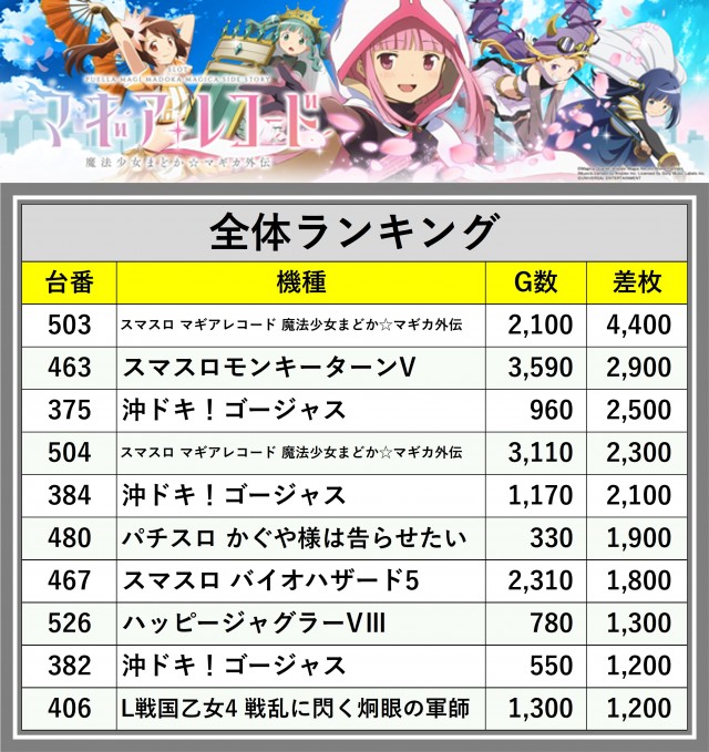 厳選された取材対象機種をはじめ、その他スロット全体から好記録が飛び出した!プレイヤーが楽しんだ1日を下記データにて振り返ってみて欲しい。