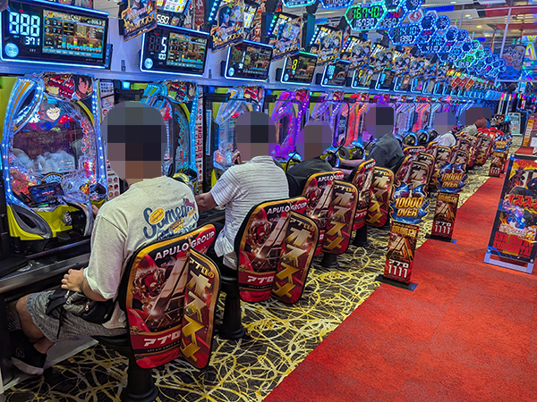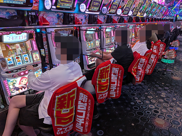 1000円/180枚パチスロの稼働も高い。楽しそうにレバーを叩くプレイヤーの姿を複数目撃している。