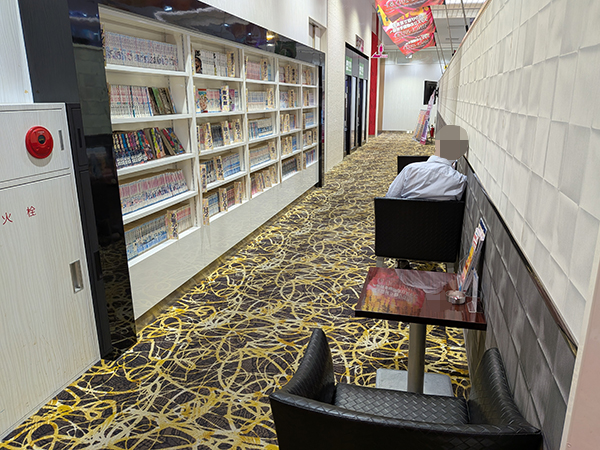 レストスペースには幅広いジャンルの漫画本が用意されており、取材時も満喫するプレイヤーが多かった。