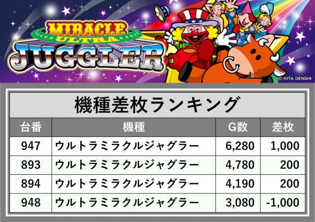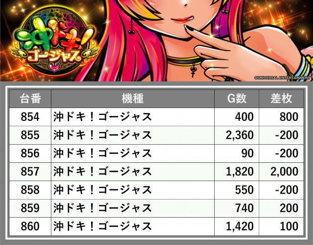 厳選された取材対象機種をはじめ、その他スロット全体から好記録が飛び出した!プレイヤーが楽しんだ1日を下記データにて振り返ってみて欲しい。