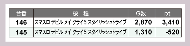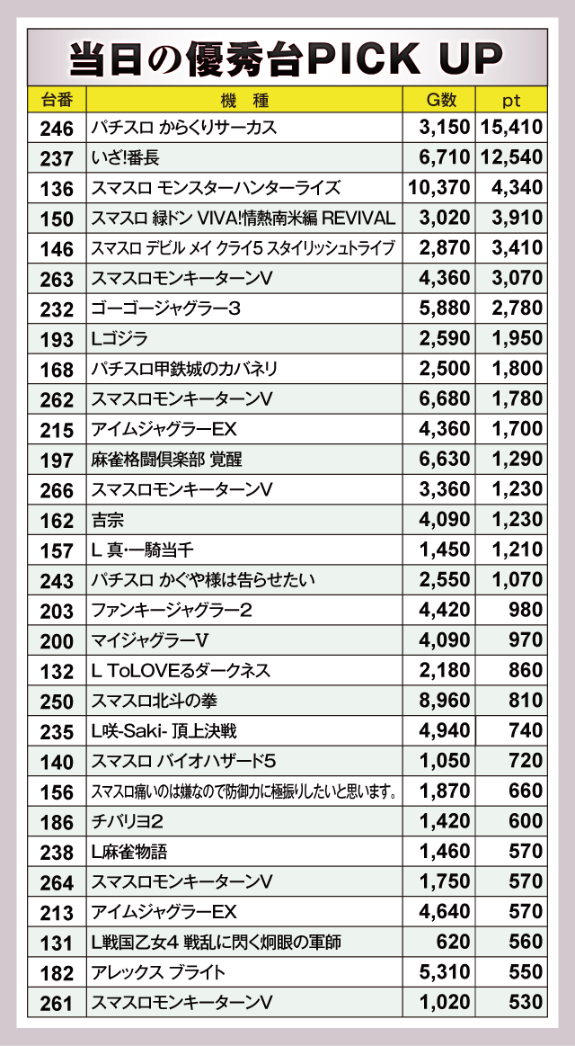 『パチスロ からくりサーカス』246番台が+15,410pt、『いざ!番長』237番台が+12,540ptと、ひときわ輝く成績を残していた。さらに『スマスロ モンスターハンターライズ』136番台の+4,340pt、『スマスロ 緑ドン VIVA!情熱南米編 REVIVAL』150番台の+3,910pt、『スマスロ デビル メイ クライ5 スタイリッシュトライブ』146番台の+3,410ptがつづく。以下にも4桁プラスptの台がズラリと並び、見応えのあるデータが仕上がっている。
