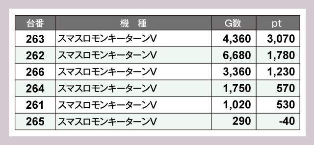 定番人気の『スマスロモンキーターンV』は6台中5台がプラスptで、安定感を放っている。