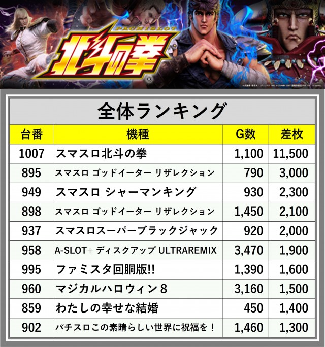厳選された取材対象機種をはじめ、その他スロット全体から好記録が飛び出した!プレイヤーが楽しんだ1日を下記データにて振り返ってみて欲しい。