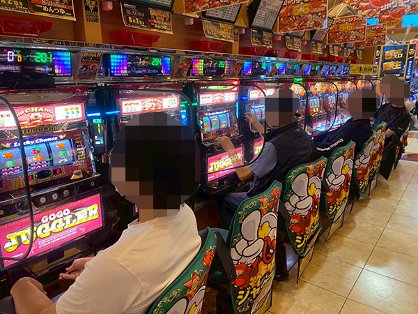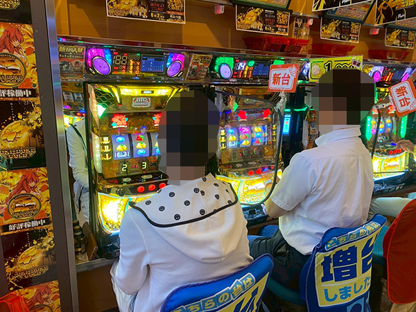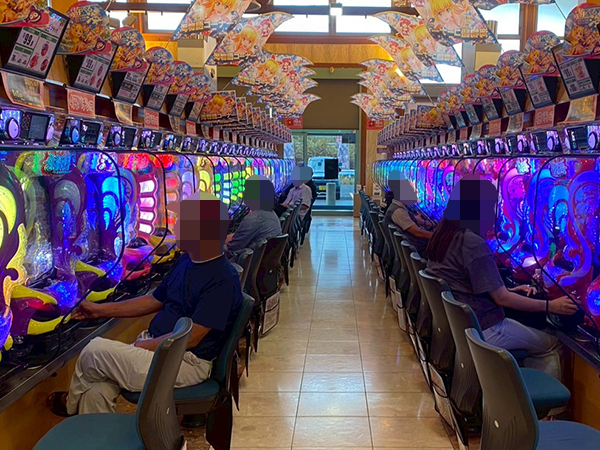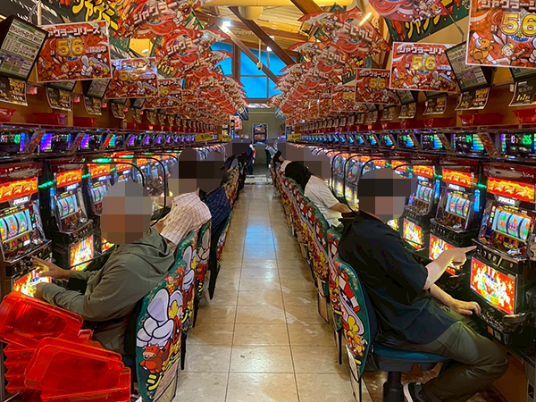 取材時は多くのプレイヤーが来店。パチンコ・パチスロともに、様々な機種が支持を得ていた。