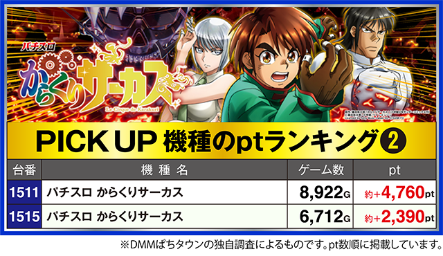 2台が約+2,300ptを超えた「パチスロ からくりサーカス」では、1511番台が約+4,760ptとなった。