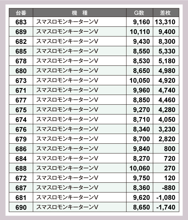 この日、最もプレイヤーの注目を集めていたのが『スマスロモンキーターンV』で、683番台の+13,310枚を皮切りに+9,400枚、+8,300枚とハイスコアを連発。しかも、全20台中17台がプラス差枚で実戦を終えているだけに、ファンにとって充実の一日になったのは間違いないだろう。