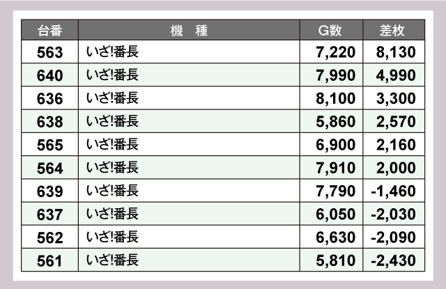また、その他の機種で目立っていたのが『いざ!番長』。563番台の+8,130枚をはじめ+4,990枚、+3,300枚と、こちらも多数の好調台が確認されており、シマ内は常に活気とファンの笑顔に溢れていた。