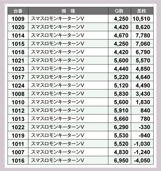 店内で最もプレイヤーの注目を集めていたのが『スマスロモンキーターンV』で、1009番台の+10,510枚を皮切りに+8,620枚に+7,000枚超が2台といったハイスコアを連発。最終的に全18台中13台がプラス差枚となる圧巻の結果を残している。