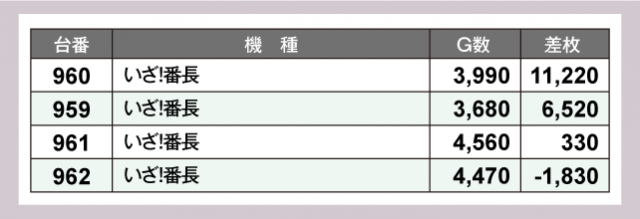 さらに、その他の機種を見てみると『L戦国乙女4 戦乱に閃く炯眼の軍師』と『いざ!番長』からも万枚超が発生。また、『L麻雀物語』からは+6,300枚が確認されており、それぞれのシマは常に活気に満ち溢れていた。