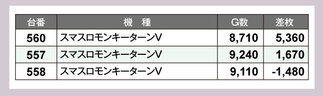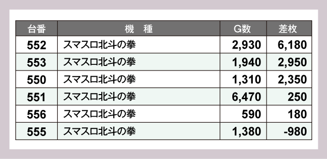 長期稼働中の『スマスロモンキーターンV』は設置全台が十分なG数がまわされていて、トータルでも大きくプラス差枚を叩きだしていた。『スマスロ北斗の拳』は6台中5台がプラス差枚で、6,000枚オーバーも飛びだし優秀な成績をおさめている。
