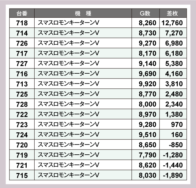 早速、店内状況をチェックしていくと、特に盛り上がりを見せていたのが『スマスロモンキーターンV』。718番台が万枚超の+12,760枚、714番台が+7,270枚といったハイスコアを連発させプレイヤーの注目を集めていた。